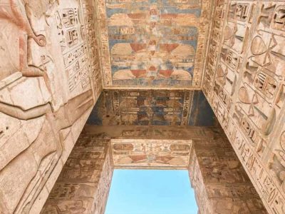 Pylons and Courtyards: Approaching the temple, visitors are greeted by massive pylons adorned with detailed reliefs depicting Ramesses III’s victories over foreign invaders. Beyond the pylons, vast courtyards unfold, inviting exploration of the various halls, sanctuaries, and chambers within the temple complex.
